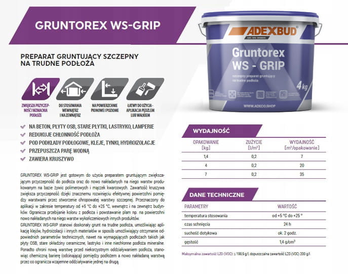 GRUNTOREX WS-GRIP jest gotowym do użycia preparatem gruntującym zwiększającym przyczepność do podłoża oraz do nowo nakładanych na niego warstw produkowanym na bazie żywic polimerowych i mączek kwarcowych. Zawartość kruszywa zwiększa przyczepność dzięki znacznemu rozwinięciu efektywnej powierzchni pomiędzy warstwami przez stworzenie chropowatej warstwy szczepnej. Przeznaczony do aplikacji w zakresie temperatury od +5 °C do +25 °C, wewnątrz i na zewnątrz budynków.